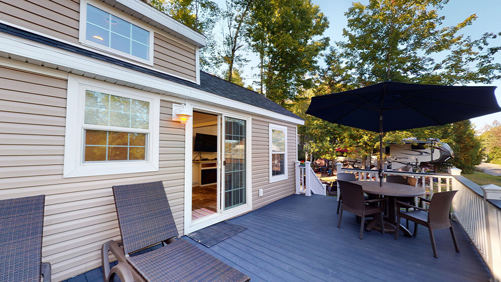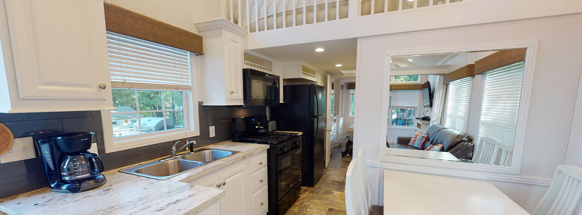 The Morning Glory is a 2019 Skyline 37 1/2 foot Park Model, which accommodates 5 persons. The one bedroom unit (queen-sized bed) has additional sleeping in the den (queen-sized pull out sofa) as well as a double loft–which has private sleeping quarters on each side (twin-sized beds.) Cathedral ceilings and large windows throughout give this open concept unit a welcome sense of space. Other features include central air, paddle fan with light, gas-lit fireplace and flat screen TV, and coffee pot. The bathroom has a tub/shower combination and a deck the length of the unit provides ample outdoor space.